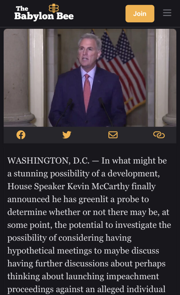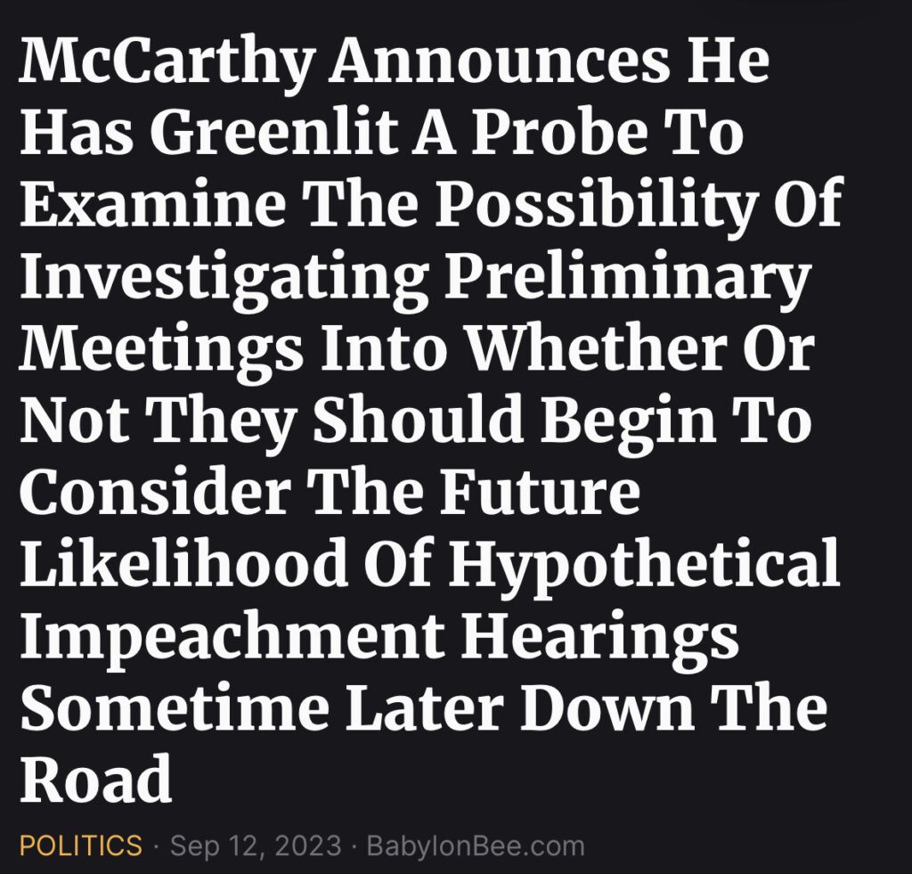 McCarthy Announces He Has Greenlit A Probe To Examine The Possibility Of Investigating Preliminary Meetings Into Whether Or Not They Should Begin To Consider The Future Likelihood Of Hypothetical Impeachment Hearings Sometime Later Down The Road September 12, 2023 by Sean-Verse https://babylonbee.com/news/mccarthy-announces-he-has-greenlit-a-probe-to-examine-the-possibility-of-investigating-preliminary-meetings-into-whether-or-not-they-should-begin-to-consider-the-future-likelihood-of-hypothet
